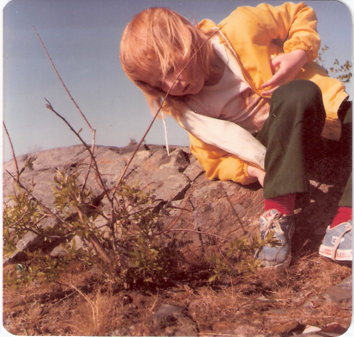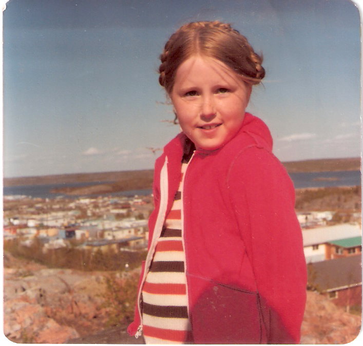 We arrived home (Yellowknife) around April 1, and Jon, Michelle and Janine settled back into school. The days were lengthening. We were living in a good size home, that was built on the side of rock shield. In our living room, there was a hunk of exposed rock where the owners had installed a metal fireplace, giving a unique effect. In Jonathan’s room on the ground level, he slept on a built- in bed, that had exposed rock under it. No dusting required under there, and no stashing of dirty clothes or odds and ends. As the snows melted, sometimes there was a trickle of water from under his bed. However, don’t be thinking it was cold in our house, it was warm. Our back yard was literally rock shield rising up from the back of our house. Jon spent lots of time there, stepping from high point to high point. See the view of the “old town” as we called it, with Michelle in the foreground. Janine, is checking out the flora and fauna .(PHOTOS BELOW)